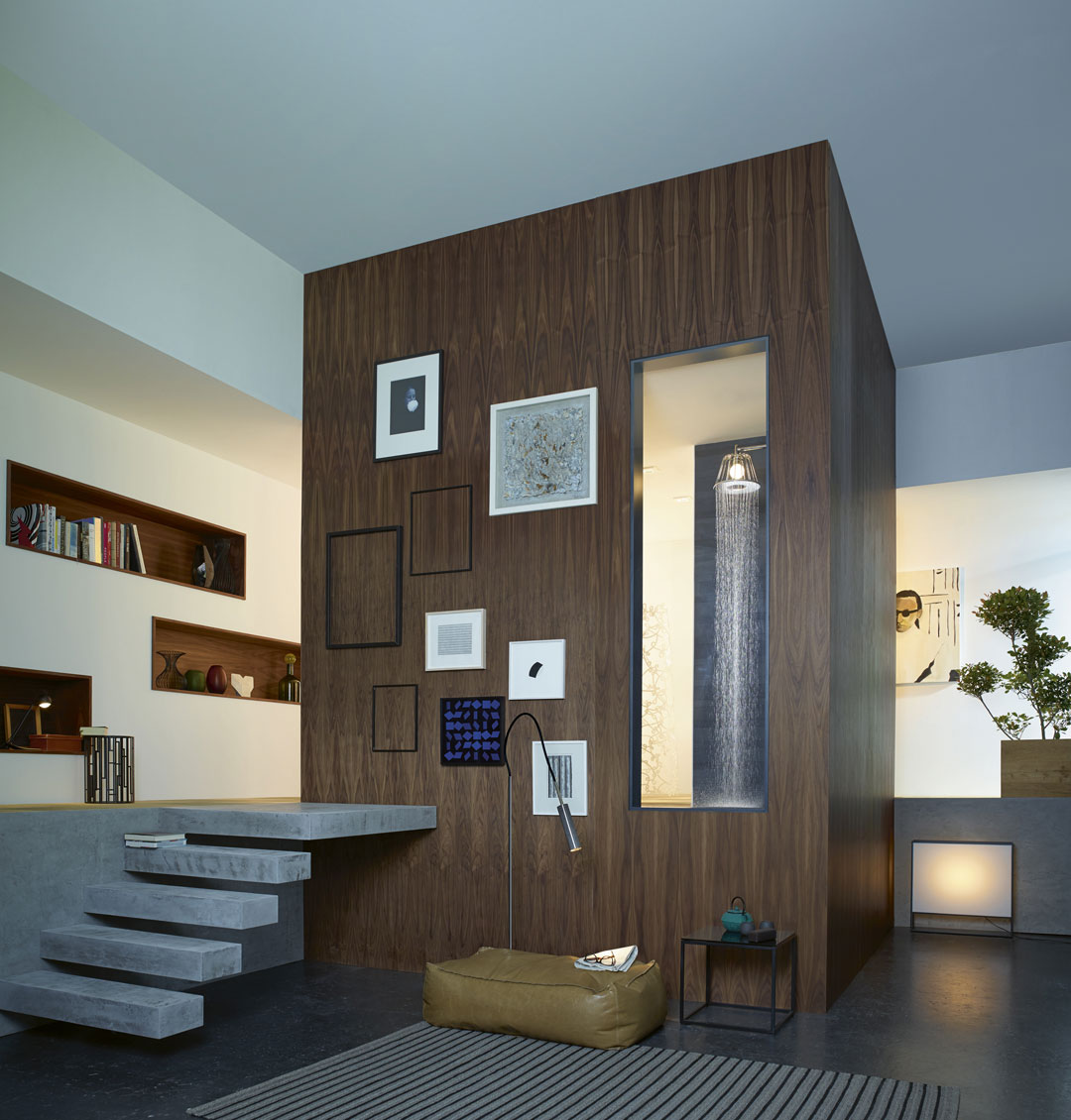 Von Axor gibt es passend zur extravaganten LampShower die elegante Armaturen-Serie Axor Citterio E. Und wenn das Badezimmer schon Blickfang werden darf, dann gerne auch mit Holzboden finden wir, z.B. Bad-Parkett von Haro.
