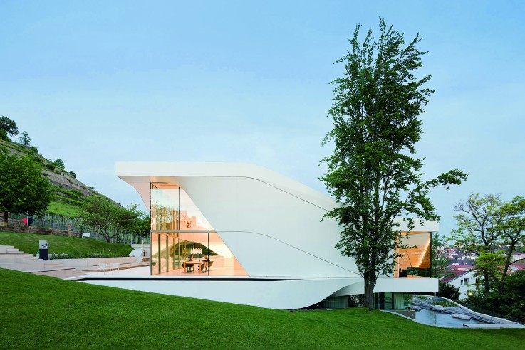 Exponierte Lage über dem Rhein: erbaut aus Naturstein, Beton und Glas bietet dieses EFH auch eine Terrasse zum Fluss.