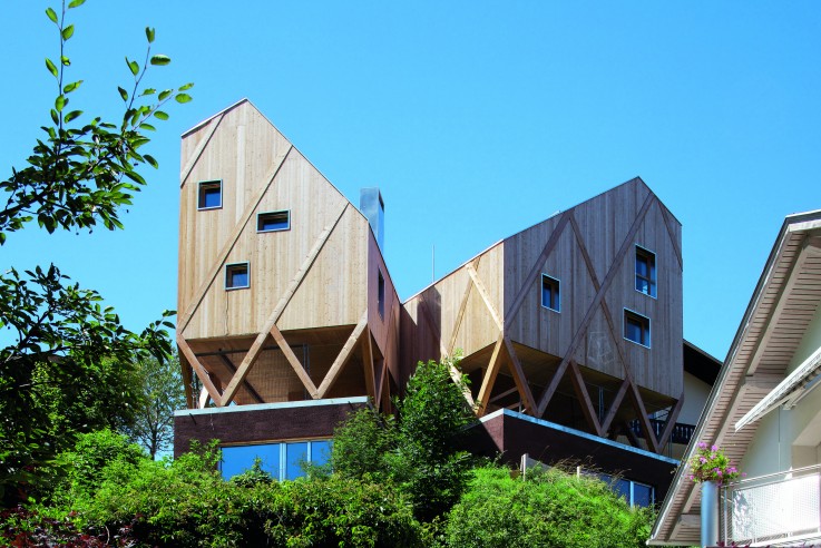 Wohnen und arbeiten unter einem Dach: Dieses moderne Fachwerkhaus aus Holz besteht aus zwei Baukörpern in Hanglage.