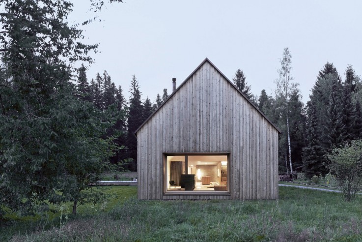 Puristisch und funktional: das Holzhaus hat keine Zimmerteilungen im Obergeschoss, dafür ein Nebengebäude mit Werkstatt.