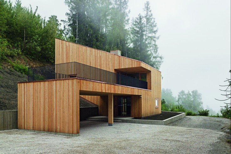 von Schaller + Sternagel Architekten. Dies ist ein kleines Haus auf einem großen steilen Grundstück. Es umschreibt wie die mythologische Urhütte alle Funktionen mit einem kompakten Baukörper. Statt des vorgeschriebenen Dachüberstands von einem Meter säumt im Erdgeschoss eine zweite Schicht, an Trauf- und Giebelkante anschließend, den umlaufenden Laubengang. Dieses Stabwerk aus vorvergrauter Weißtanne öffnet sich