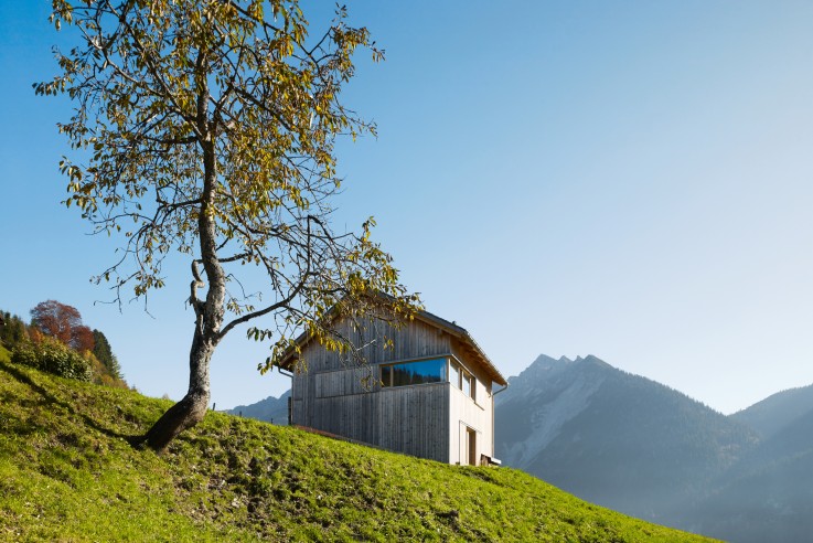 von schroetter-lenzi Architekten. Ein kleines Architektenhaus, das zusammen mit zwei alten Holzhütten wie ein Pavillon das Dorfzentrum abschließt. Die Infrastruktur mit Volksschule, Kirche, Gemeindeamt, Laden und öffentlichem Nahverkehr ist zu Fuß erreichbar. Zur anderen Seite grenzt das Grundstück an das Naturschutzgebiet am Bodensee: man schaut vom Haus ins Ried. Der begrenzte Platz legte den Anbau