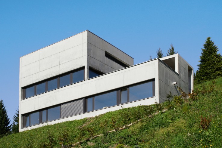 von architektur.terminal hackl und klammer. Wir befinden uns im dichtbesiedelten Vorarlberger Rheintal. An der Landstraße, die von Rankweil mit engen Kehren über das Laternsertal zum Furkajoch führt, steht dieses kleine kompakte Betonhaus. Die Herausforderung bestand darin, mit einem knappen Budget auf einem um 60 Prozent geneigten Baugrundstück zu bauen. Beton als konstruktives Material bot sich
