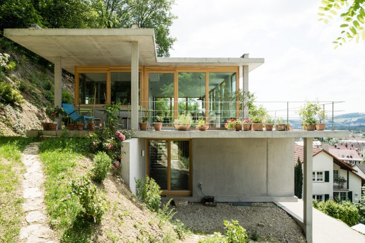 von Gian Salis. Das Grundstück ist ein mit struppigem Gehölz bewachsener, ehemaliger Rebenhang, der einen weiten Blick in das Rheintal über die Grenze bis nach Basel bietet. Die Bauherren wünschten sich ein preisgünstiges Wohnhaus mit kleinen Räumen, das sich über große Fenster mit dem natürlichen Wildwuchs verbindet. Mit zwei Terrassenmauern parallel zum Berg beginnt die