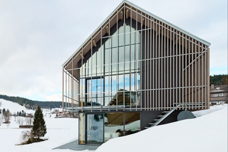 Die kristalline Form des Passivhauses zielt darauf, ein energieoptimiertes Verhältnis Oberfläche/Volumen zu erreichen.