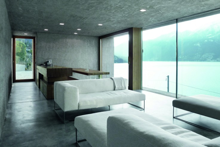 von Wespi de Meuron Romeo Architekten. Dieses Haus steht auf einem Steilhang oberhalb des Dorfkerns von Ranzo am Lago Maggiore, an der Küste des Gambarogno. Die Aussicht reicht über den See und in die Berge, aber auch die Gleise der Eisenbahn führen in Rufweite am Grundstück vorbei. Der Baukörper des zweigeschossigen Hauses lagert wie ein