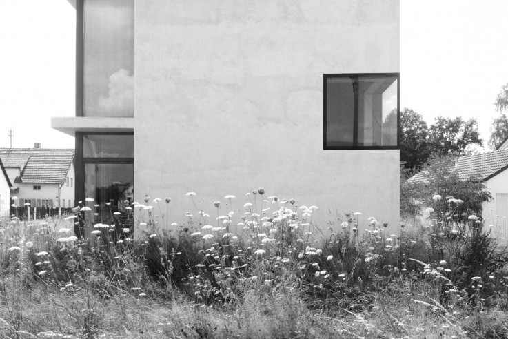 von Michael Aurel Pichler. Dies ist ein kleines Haus, fast im Ortskern von Hohenwart. Es dient als Wohnraum und Atelier, umfasst tatsächlich nur 78 Quadratmeter Fläche, aber, kalkuliert der Architekt, durch die Zweifachnutzung bestimmter Bereiche verfügt es eigentlich über 122 Quadratmeter. Diese Reduktion, diese funktionale Bescheidenheit zählt für ihn als konzeptioneller Beitrag zur Nachhaltigkeit. Doppelt