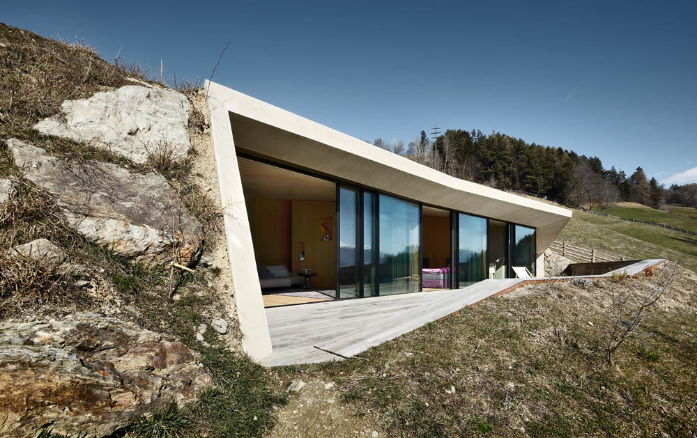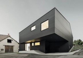Zentral betritt man das Gebäude, die Türe ist tief in den glatt betonierten, eingeschossigen Eingangsbaukörper eingeschnitten. Ein Nebeneingang führt über die Garage und Schmutzschleuse. Eine Wand aus schwarzem Stahl und Glas, in die auch der Grundofen mit Sideboard integriert ist, trennt Wohnzimmer, Essplatz und Küche mit Speisekammer. Raumhoch verglast öffnet sich der Raum nach Süden und auf die teilweise überdachte, vorgelagerte Terrasse. Streng ist die Fassade gegliedert: Schmale senkrechte Lichtschlitze durchbrechen den Gäste- und Bürotrakt, komplett öffnet sich der Terrassenraum. Ein polygonales Betongitter sorgt für Licht- und Schattenspiele auf dem Holzrost am Boden, das markante Muster wiederholt sich zudem an der Decke im Wohnzimmer und sorgt dort für gute Akustik. Im Obergeschoss sind die Schlafräume sowie das Kinder- und Elternbad untergebracht, eine kreisrunde Dachkuppel belichtet die Ankleide.