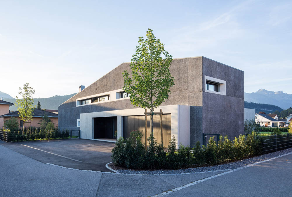 Eine nicht zu helle Fassade, zeitlos und pflegeleicht, ein Haus mit einer großen Garage und einem kleinen Keller, auf einem ebenen Grundstück, rechteckig, nach Süden ausgerichtet, in einem von Einfamilienhäusern geprägten Quartier: Mehr Vorgaben gas es nicht seitens der Bauherren, die Projekte aus dem Vorarlberger Büro von Rainer Huchler und Marika Marte kannten und die Zusammenarbeit mit dem Architekten und der Innenarchitektin gesucht hatten. Die Bauherren verbringen viel Zeit in der Natur und in den Bergen. Ein raues, haltbares Material, das sich kaum verändert, fast wie ein Fels, erschien Rainer Huchler daher richtig – und er überzeugte sie, Beton als Baustoff für die Außenhaut zu verwenden. Ein Steinbruch nur ein paar wenige Kilometer entfernt, lieferte den nötigen Zuschlag und verleiht dem Haus heute seinen markanten Charakter: gebrochenes, dunkles, graugrünes Steinmaterial, das nach dem Ausschalen gewaschen wurde; das heißt, die Feinteile wurden ausgeschwemmt, die Fassade erscheint dunkelgrau. Als Kontrast dazu umfassen Betonfertigteile aus mit Rundkorn gemischtem Beton und schalglatt hergestellt die lasierten Fichtenholzfenster. Auch die Zubauten und die Terrasse wurden aus gewohnt hellem Beton gefertigt.