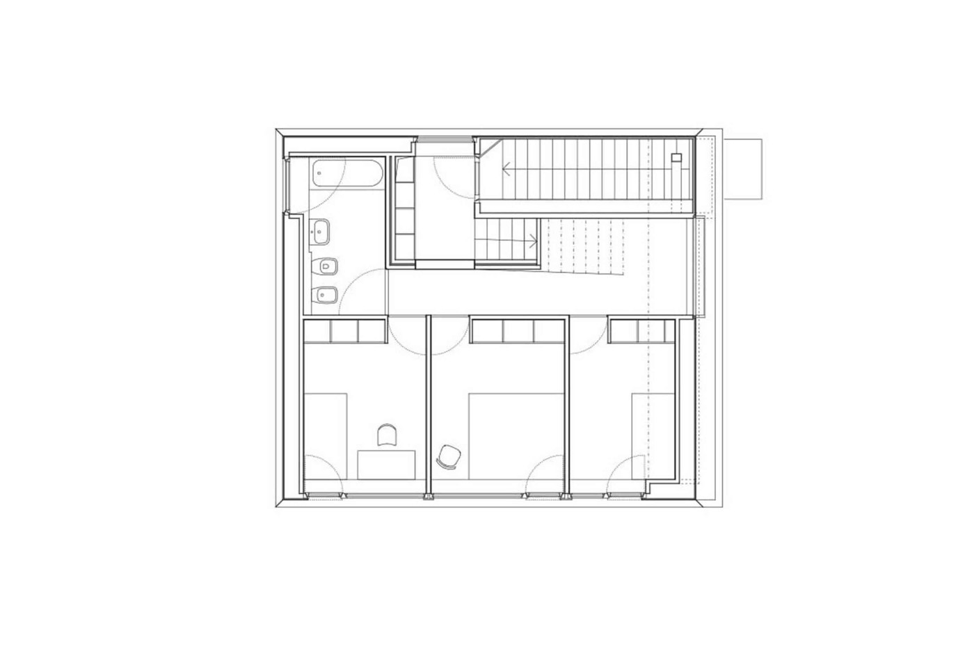 Der mit knappem Budget realisierte, elementierte Holzbau für sechs Personen birgt im Inneren ein differenziertes und spannungsvolles Raumgefüge, das mit geringem Aufwand in zwei separat erschlossene Wohneinheiten geteilt werden kann.