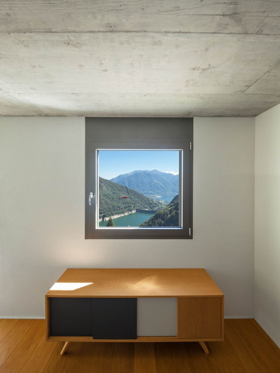 Bei dem als Ferienhaus geplanten Gebäude, das sowohl als Einfamilienhaus genutzt als auch in zwei Wohnungen aufgeteilt werden kann, ließ sich der in Lugano ansässige Architekt, der zudem Kunst und Innenarchitektur studiert hat und zwanzig Jahr mit Mario Lotta gearbeitet hat, von der ländlichen Bautradition inspirieren. Drei Geschosse streckt sich das Haus in die Höhe, die Dachneigung verläuft senkrecht zum Hang. Das Volumen teilt sich auf in zwei schmale sattelgedeckte Häuser, von denen eines auf der dem Tal zugewandten Seite ein wenig nach vorne gerutscht zu sein scheint. In Höhe und Proportion entspricht der wie ein Doppelhaus wirkende Neubau damit den schlanken, traditionellen Rustici. Lediglich die gekonnte, skulpturale Setzung der Fensteröffnungen sowie der Einschnitte für die Loggia im Erdgeschoss und die fein detaillierte Ausbildung der Dachkante verraten die Heutigkeit des Hauses.