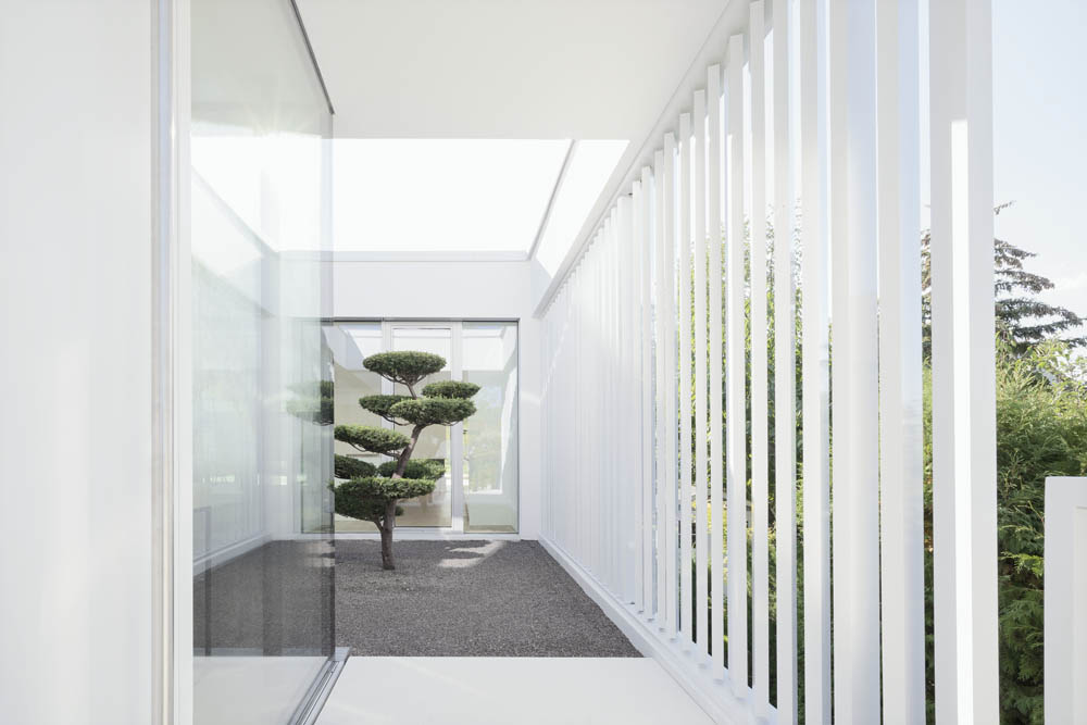 Bernd Liebel plante einen klassischen Bungalow, Form und Material sind bewusst schlicht, einfach und reduziert. Das den Hang nutzende, strahlend weiße Gebäude mit eindrucksvoller Dachscheibe besetzt fast die gesamte zulässige Fläche des Baufensters und hält auch zur Südgrenze hin nur den Mindestabstand ein. Einschnitte in das Raum- wie in das Dachvolumen lassen viel Licht ins Haus, Südsonne fällt in die offene, fließende Raumabfolge. Essen, Kochen und Wohnen werden zwei- oder dreiseitig belichtet. So offen sich das Haus Richtung Süden präsentiert, so geschlossen wirkt es nach Norden, wo in geringem Abstand zwei Nachbarhäuser stehen. Ein durch vertikale Lamellen sichtgeschütztes Atrium erhellt den Eingangsbereich, ein weiteres auf der Südseite lässt die Morgensonne ins Haus. Der Außenraum ist Teil des Hauses, durch den Einbau von bodentiefen Fenstern gehen der Wohnbereich und die überdachten Terrassen beinahe unmerklich ineinander über. Die Garage, Technikräume sowie ein Büro befinden sich im Untergeschoss, das Leben der vierköpfigen Familie wurde barrierefrei im Erdgeschoss organisiert.