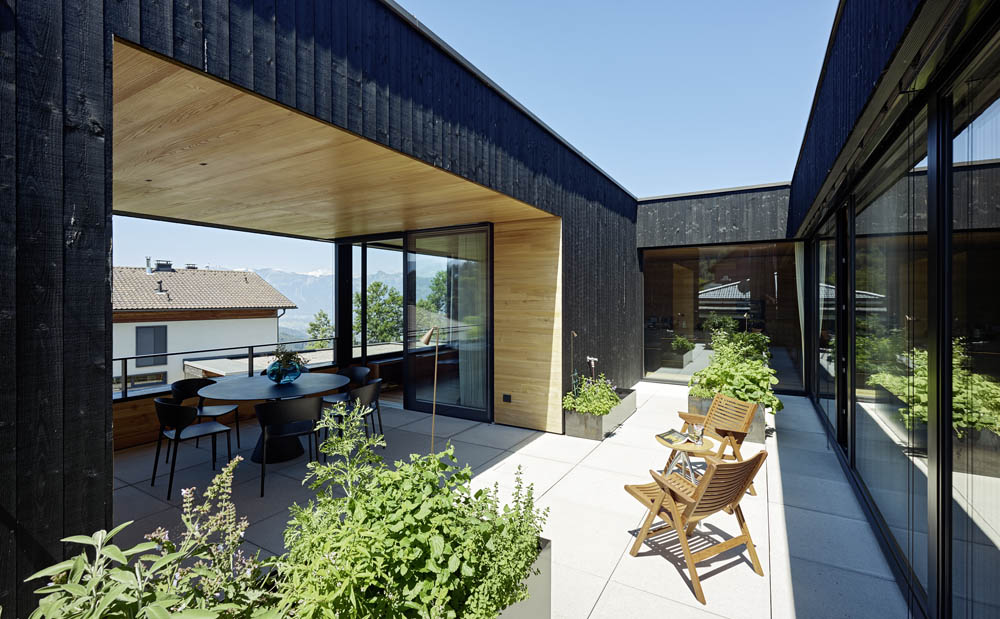 Funktional wie konstruktiv wurden Oben und Unten unterschiedlich gestaltet: Leicht sitzt die Holzkonstruktion auf dem Betonsockel auf und sorgt für eine warme Atmosphäre. Einheitlich jedoch ist der Baukörper außen mit dunkel lasierten Holzschindeln umhüllt, innen wurden Decken, Wände und Böden mit Ulme verkleidet. Das edle Holz ist kräftig gemasert und harmonisiert mit der massiven Treppenhauswand, die mit einer Kalkspachtelung mit Pigmentfarbanstrich versehen ist. Von allen Wohnräumen bleibt das imposante Panorama vom Rätikon bis zum schweizerischen Alpsteinmassiv im Blick.
