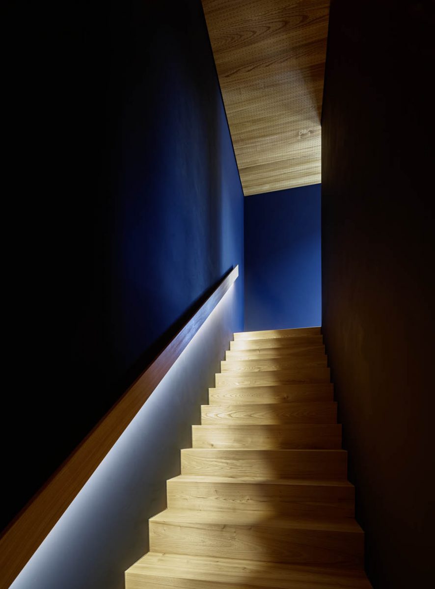 Das Sockelgeschoss ist kompakt. Es erschließt das Haus und beherbergt Haustechnik, Nebenräume sowie die Garage und wurde in Beton ausgeführt, sie schützt den Eingang vor der Witterung und beschirmt die Aussicht aus dem Gäste- und Arbeitszimmer. Eine einläufige Holztreppe verbindet: Sie führt in den lichtdurchfluteten und im Winkel um einen Terrassenhof angeordneten, großzügigen Koch-, Ess- und Wohnbereich. Auch das Schlafzimmer mit Ankleide, ein Bad und die Sauna finden hier Platz. Nicht einsehbar nehmen sie einen kleinen Innenhof in ihre Mitte.