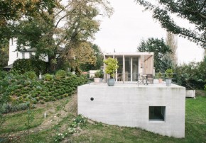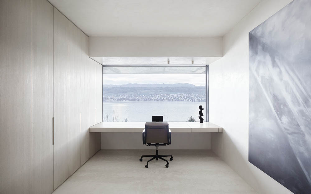 Der höchste Punkt der Villa ist dem eleganten Masterbedroom mit angrenzendem Bad, Sauna und Ankleide vorbehalten. Der eher gemeinschaftliche genutzte Garten liegt auf der südöstlichen Seite der Villa. Durch die Verschiebung der beiden Baukörper entsteht ein überdachter Außenraum, ein Sitzplatz wurde in den Boden versenkt. Parallel zur Krete erstreckt sich der 15 Meter lange Pool, er scheint in den Zürichsee überzugehen. Die Gartenparzelle auf der gegenüberliegenden Hausseite ist dem Rückzug gewidmet. Eine hohe Schwarzföhre schirmt diesen Bereich vom Nachbargrundstück ab.