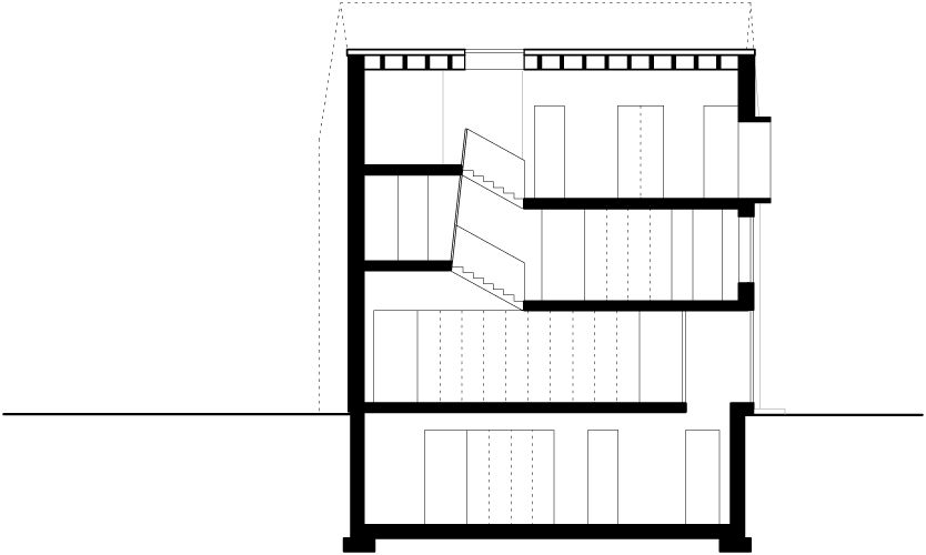Das Erdgeschoss wird von der Vor- und Rückseite erschlossen. Das Untergeschoss ist von einem Tiefhof belichtet und könnte durch eine Außenstiege abgetrennt werden. Die Haupttreppe führt an der Außenwand entlang über viereinhalb Geschosse nach oben. Zusammen mit Funktionen wie Garderoben, Schrankräumen, Nasszellen und Küchenzeile ist diese dienende Zone nur 2 Meter breit.