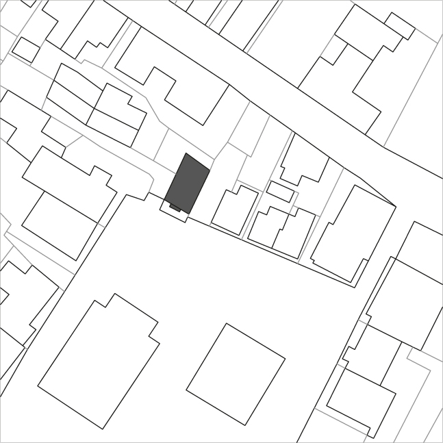 Das neue Haus vervollständigt die Raumkante, die Lücke wurde bisher als Parkplatz genutzt. Der Grundriss übernimmt die Form eines Parallelogramms vom unregelmäßigen Zuschnitt der Parzelle und reagiert auf einen vorhandenen Brunnenschacht. Der Innenraum ist als Wohnskulptur entwickelt, das heißt, es gibt über die Geschossebenen reichende Verbindungen, Lufträume, die das Gehäuse in seiner Höhe erleben lassen. Kalkulierte Ausblicke in die Altstadt erscheinen wie große Bilder in den Fassadenöffnungen. Die sind zum Teil fest verglast und erkerartig angelegt, als kleine Loggia eingeschnitten oder als auskragendes Panoramafenster mit Blick bis zur Schwäbischen Alb inszeniert.