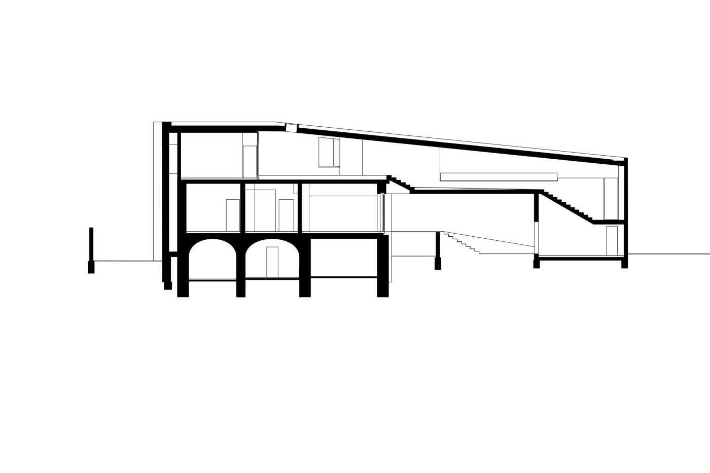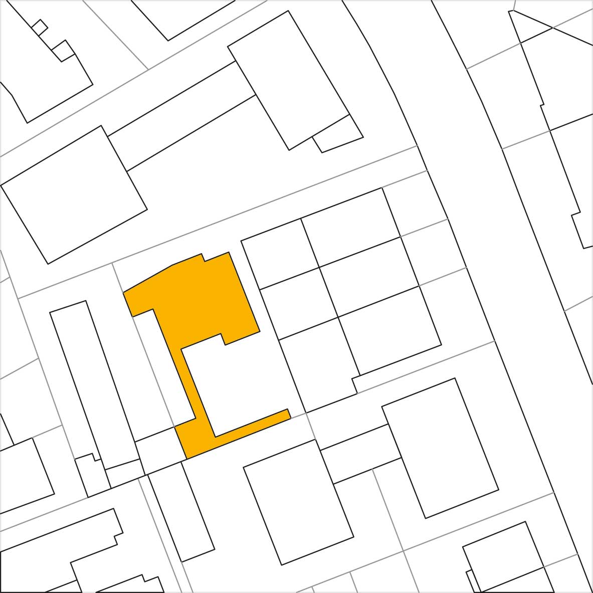 Vorhanden war ein eingeschossiges Gebäude aus den Fünziger-Jahren, das wie ein Stumpf überbaut wurde, aber – bis auf einen erhaltenen Gewölbekeller – an dem neuen Haus kaum mehr abzulesen ist. Die weiteren Konditionen folgten den einzuhaltenden Abstandsflächen. Daraus ergab sich in zwei Schritten die Anpassung einer zunächst fiktiven Grundkubatur, die das gesamte Grundstück besetzte.