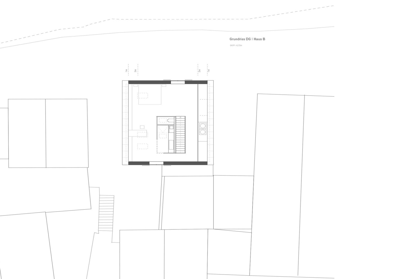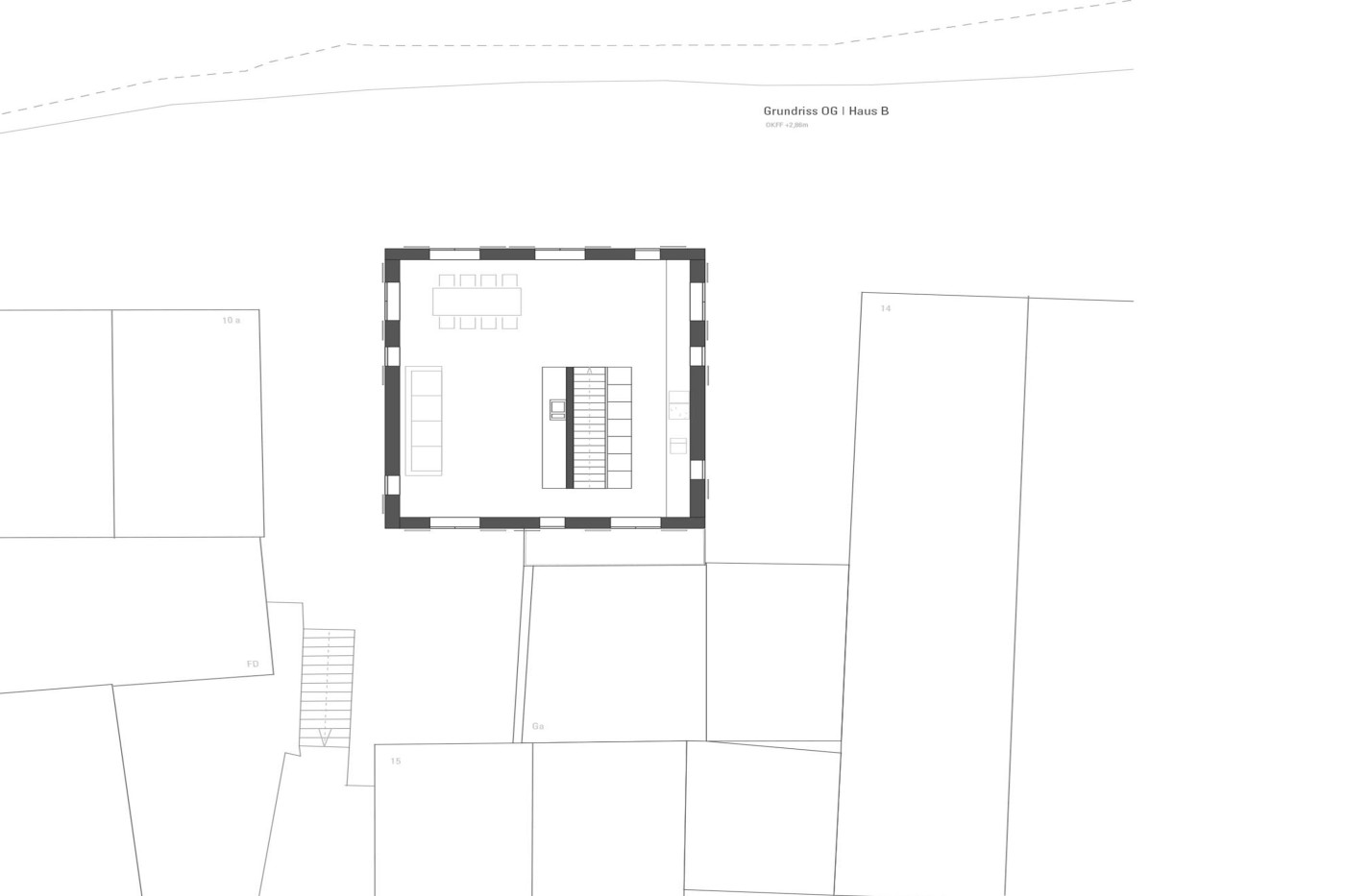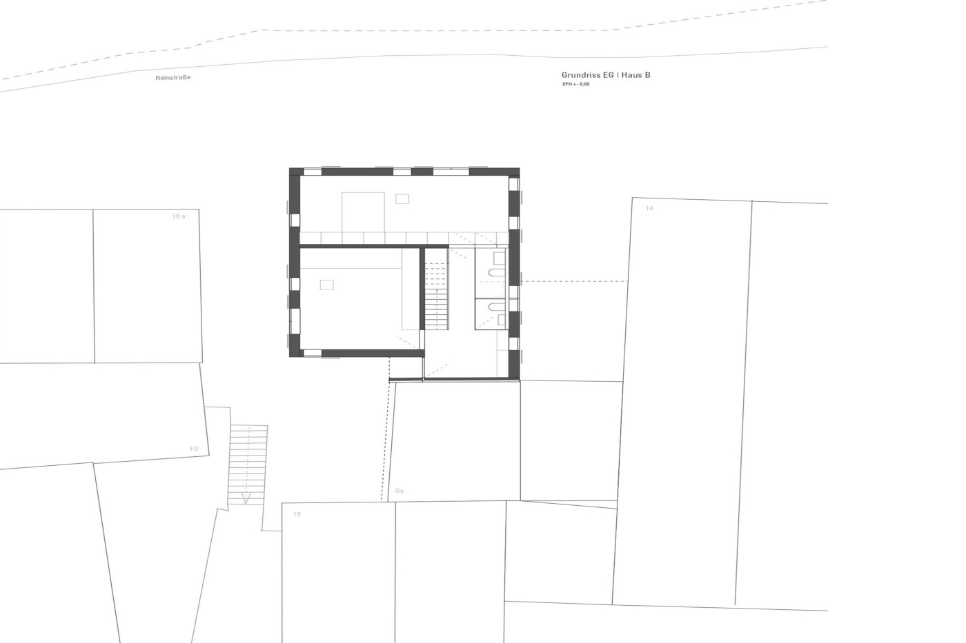 Das Grundstück im Stuttgarter Stadtteil Rotenberg, ein dörfliches Ensemble historischer Wohnhäuser, brachte besondere Auflagen mit. Der Neubau ersetzt ein altes Fachwerkhaus, hier galt es, sich in die vom Denkmalamt geforderte Kulisse einzufügen, ohne das Entstehungsjahr des Hauses zu verleugnen. Eine zusätzliche Schwierigkeit bot das kleine Grundstück, das fast exakt der Erdgeschossfläche entspricht. Rückwärtig wurde an eine Nachbargarage angebaut, hier betont an dem traditionellen, von einem Satteldach abgeschlossenen Baukörper ein kleiner Vorbau mit Balkon den Eingang. Alle übrigen angrenzenden Flächen sind öffentlich.