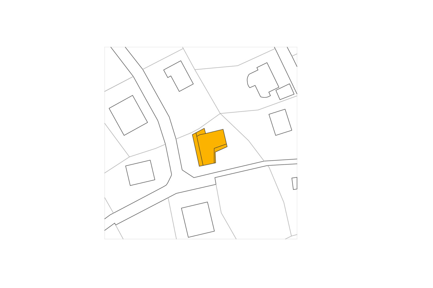 Der Bebauungsplan schrieb ein Satteldach und seine Neigung vor. Für das eingeschossige Haus wurde die Vorgabe gelöst durch eine vom Sitzpodest auf der Südseite ausgehende Faltung, die mit den schräg angeschnittenen Hausflanken beginnt und den gesamten Baukörper einbezieht. So ergab sich vorschriftengerecht eine Lösung, die aber nicht wie ein konventionelles Satteldach wirkt. Die Faltung differenziert die einzelnen Bereiche und gibt der Kubatur eine eigene Spannung. Das Haus erhält eine rätselhafte Perspektive und sieht aus jeder Richtung anders aus.