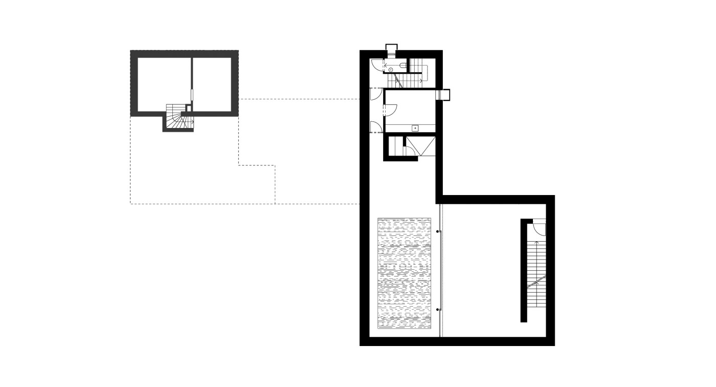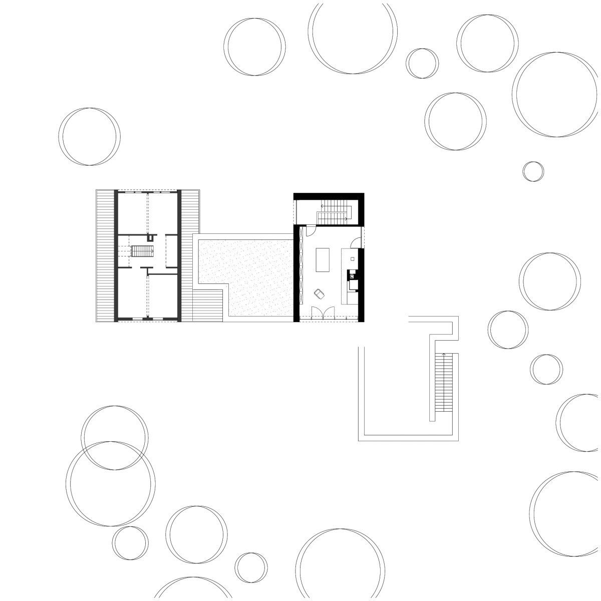 Der innere Weg wird ebenfalls aufgenommen und zum Neubau hin verlängert. Er endet im Obergeschoss mit Weitblick zum Tal und im Untergeschoss mit dem Austritt zum Innenhof, der das dort einge-baute Hallenbad belichtet.