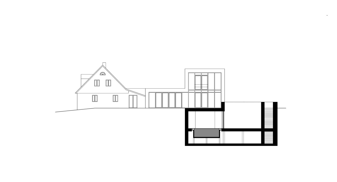 Die Architekten entschlossen sich, eingeschossig an das vorhandene Haus anzuschließen und diesen Zwischentrakt zweigeschossig zum Garten fortzusetzen. Dabei wurden die Fluchten des Altbaus respektiert, sodass von der Straße gesehen seine Präsenz und Anmutung nicht beeinträchtigt wird.