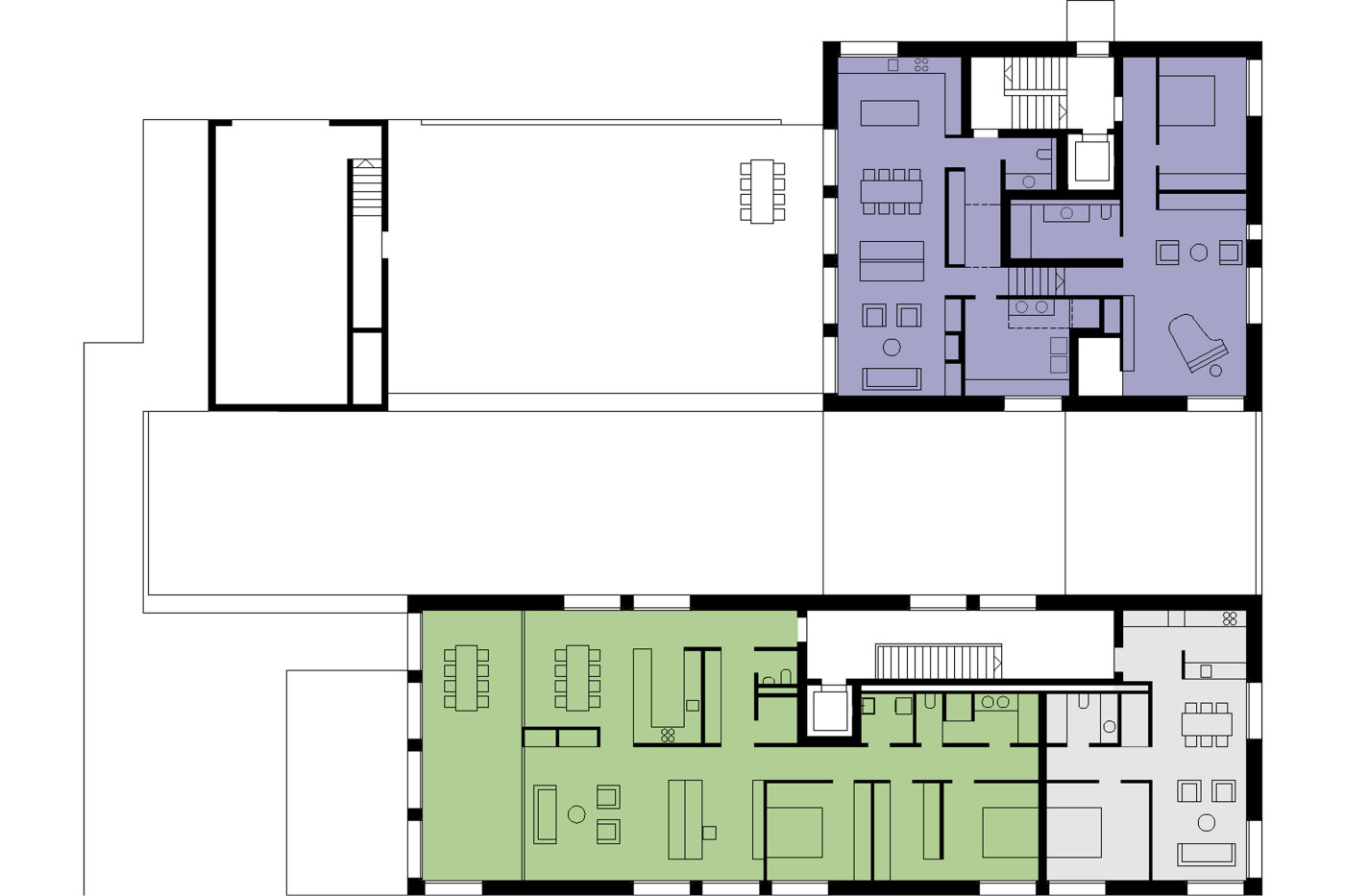 Die Innenwände aus Fichte-Verbundplatten zeigen ebenfalls das Material, der versiegelte Estrich antwortet mit dunkelgrauer Neutralität. Die Holz-Alufenster sind dreifach verglast. Die Wohnungen liegen auf einer oder zwei Ebenen, erreichen zum Teil übergroße Raumhöhen, extern gehören ein Büro, Musik- und Werkstattraum dazu. Ansonsten sind sie ähnlich organisiert und unterscheiden sich vor allem darin, wie der Wohnraum mit Essplatz und Küche von den übrigen Zimmern abgetrennt ist. Es gibt zwei Zugänge, deren Stiegenhäuser im Untergeschoss verbunden sind. Das Familienwohnhaus ist im Passivhausstandard ausgeführt. Was zunächst wie ein Tragskelett wirkt, reduziert sich auf eine gliedernde Struktur, ein silbernes Architekturgerüst, das die Familie zusammenhält.