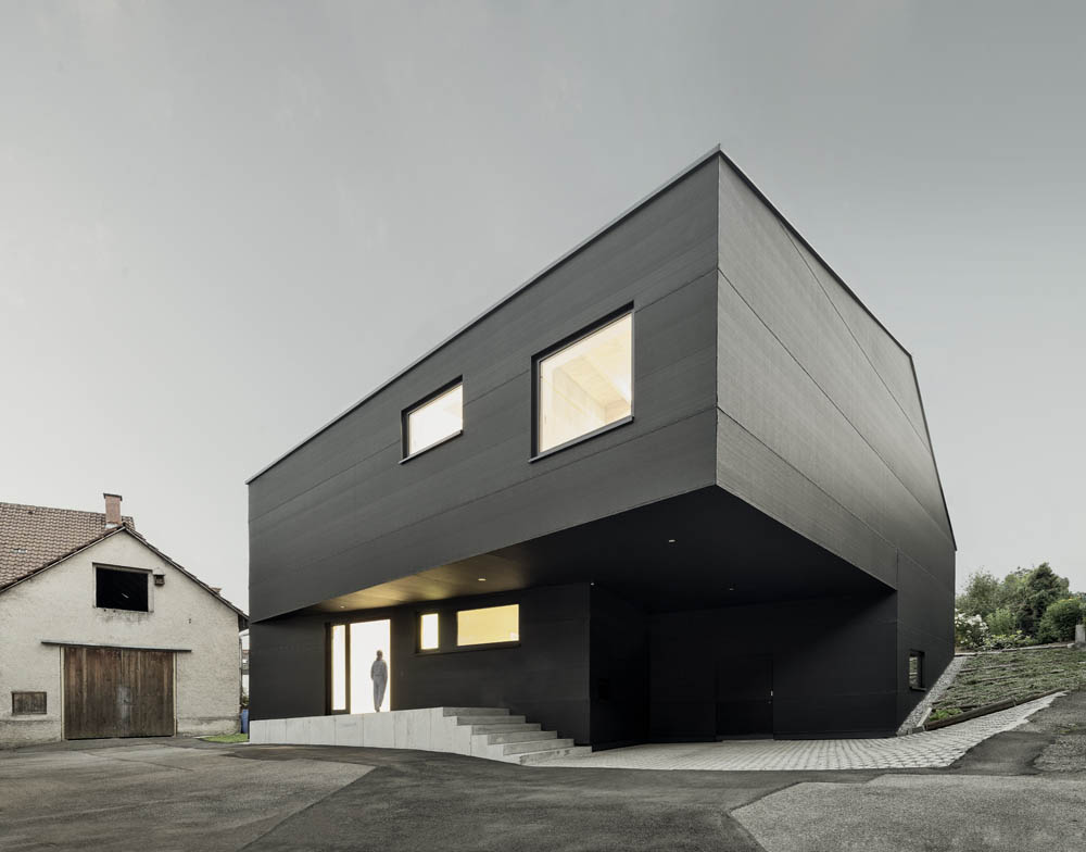 Blickbeziehungen werden bewusst inszeniert. Die Räume sind zudem auf die Abläufe im Haus und den Sonnenstand abgestimmt: Sonne fällt am Morgen ins Schlafzimmer, Südsonne erhellt das Wohnen und Abendrot den Koch- und Essbereich. Die Materialwahl entspricht dem Konzept: Die tragenden und erdberührenden Bauteile der sich kreuzenden Wände und die Bodenplatte verbleiben als rohe Betonkonstruktion, auch das Betonkreuz ist purer Sichtbeton. Die Außenwände und das Dach hingegen sind aus Holz gefertigt und innen weiß verputzt. Seekieferplatten wurden für die Treppenstufen verwendet sowie in einigen Bereichen auf dem Boden verlegt. Das Äußere des Gebäudes setzt sich mit seiner tiefschwarzen Textilfassade und einem ebenso schwarzen Stehfalzblechdach ab von der rötlichen Dachlandschaft der Nachbarschaft.