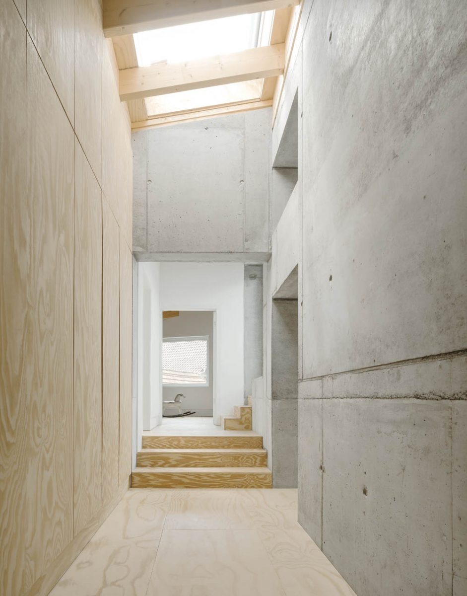 Auch die innere Ordnung des Gebäudes richtet sich nach dem ansteigenden Gelände: Das Haus wird von zwei Betonscheiben gegliedert, die sich in der Mitte des Hauses kreuzen und es in vier Segmente teilen, zwischen denen sich die Ebenen des Wohnraums aufspannen. Spindelförmig schrauben sie sich im Uhrzeigersinn nach oben und führen in einem durchaus wörtlich zu nehmenden „Rund“-Gang durch das Haus: von einem Betonpodest vor dem Eingang über Wohn- und Essräume zum Schlafbereich im Obergeschoss bis zur Dachterrasse mit Blick nach Südwesten und über die gewachsene Dachlandschaft der Kleinstadt.