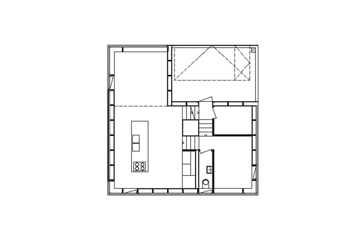 Man betritt das rätselhafte Bauwerk entweder durch die Garage oder eine unauffällige Tür in der Terrassenloggia, die sich durch ein Schwingtor auch über die gesamte Breite öffnen lässt. Der erste größere Raum ist die Küche mit dem über zwei Geschosse reichenden Essplatz, neben beiläufig passierten Funktionsräumen erreicht man auf dem Weg nach oben Schlafzimmer, eine Sauna und schließlich den Wohnraum, der bis unter das als flache, asymmetrische Pyramide aufliegende Dach reicht. Hier lässt sich eine Fensterwand öffnen, sodass man wie auf einer Veranda im Freien sitzen kann. Konstruiert ist das Haus aus 40 Millimeter dicken Blockholzplatten. An den Außenwänden sind sie über senkrecht stehende Rippen, zwischen denen die Wärmedämmung liegt, und eine Konterlattung zu Elementen gefügt. Die Innenwände sind als eigenständige Kuben montiert, die über einen Zwischenraum von 20 Millimetern zusammenstoßen.