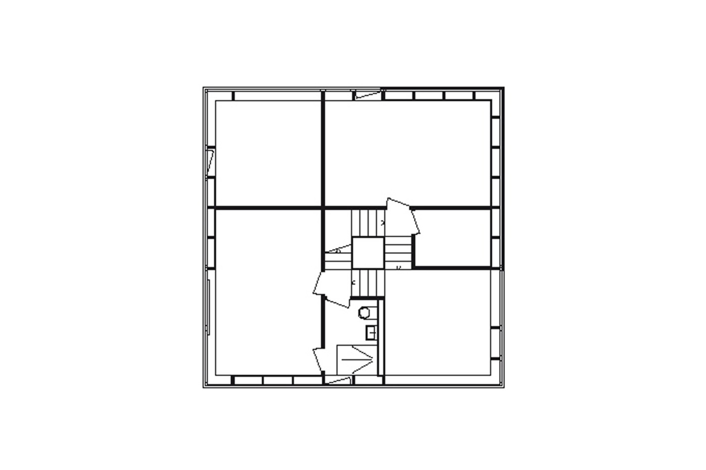 Verschieden große Raumzellen sind in einer komplexen Raumfigur um eine vierläufige Treppe im Kern des Hauses gestapelt. Von außen ist das Haus betont unaufgeregt, ohne die expressiv räumliche Geste preiszugeben.
