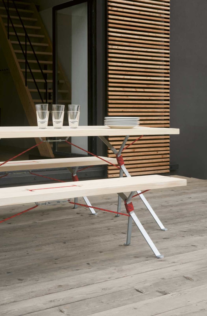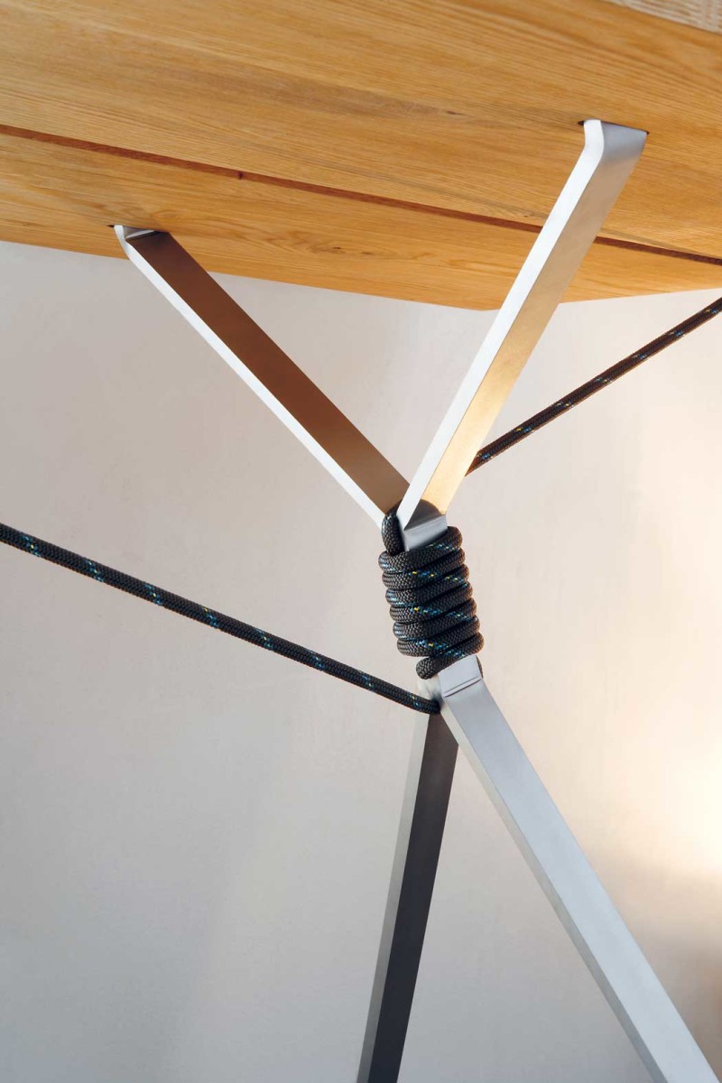 Um diese Kampenwand zu bezwingen, muss sich der Tisch- und Bankbesitzer weder mit Seil- noch mit Knotenkunde vertraut machen. Dieses Ziel ist für jedermann einfach zu erreichen. Ordentlich verspannt und gesichert, bleibt die Kampenwand drinnen wie draußen standfest. Der Kampenwand Tisch wurde zusammen mit der Kampenwand Bank von Nils Holger Moormann höchstpersönlich im Jahr 2011 designt und ist ein wirkliches Allroundmöbel. Mit Stahlbeinen in gewachster oder verzinkter Ausführung macht der Moormann Tisch sowohl im Indoor- als auch im Outdoorbereich eine gute Figur. Der Mix aus Stahl, naturbelassenem Holz und Bergsteigerseilen verbreitet im Wohnbereich ein Freiluftfeeling und bringt auf der Terrasse und im Garten genau die richtige Robustheit mit. Zusammen mit der Kampenwand Bank entsteht eine rustikale Sitzgruppe, in der gemütliche Runden zum Essen, Trinken oder einfach nur für gesellige Gespräche Platz finden.