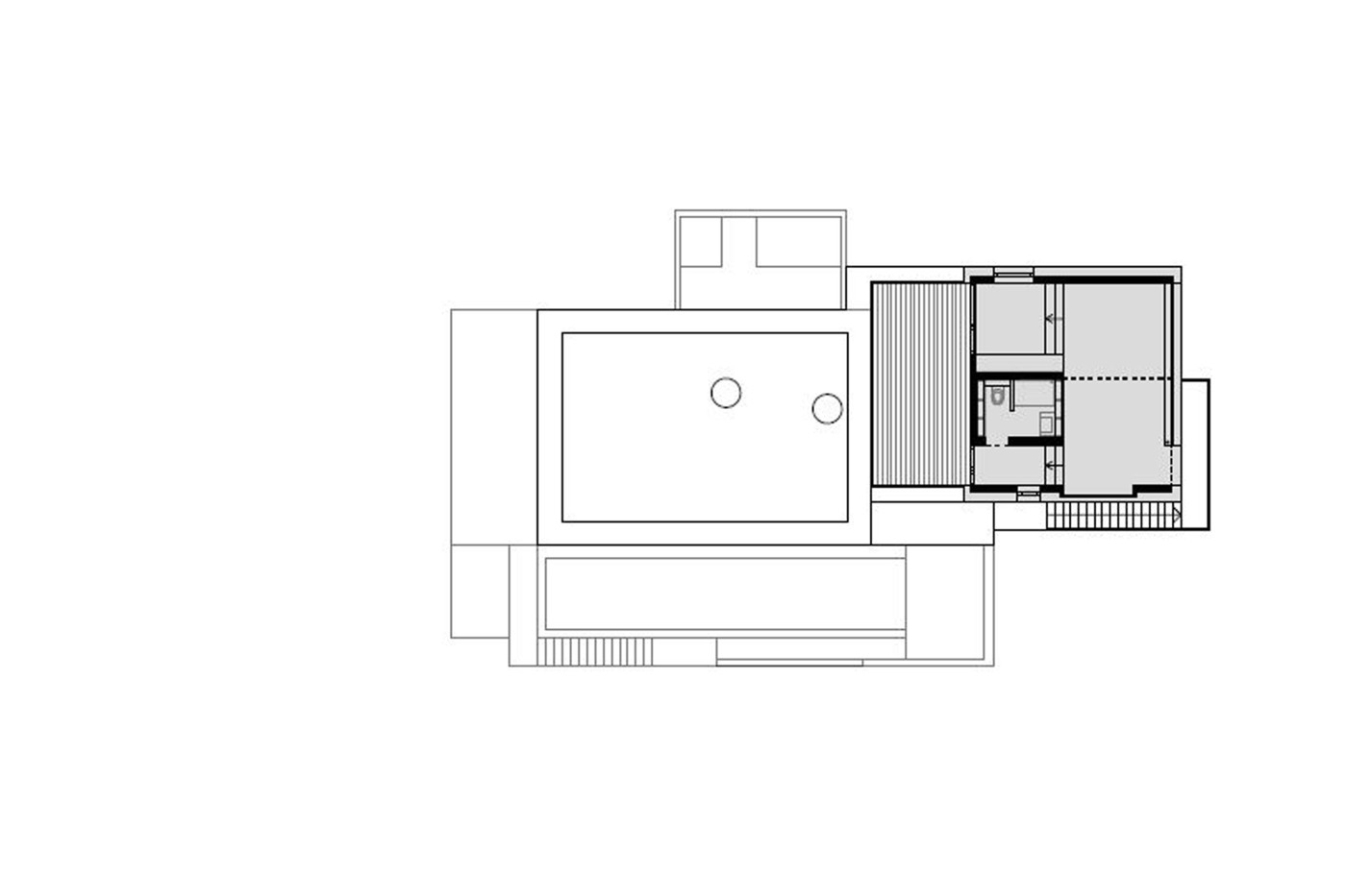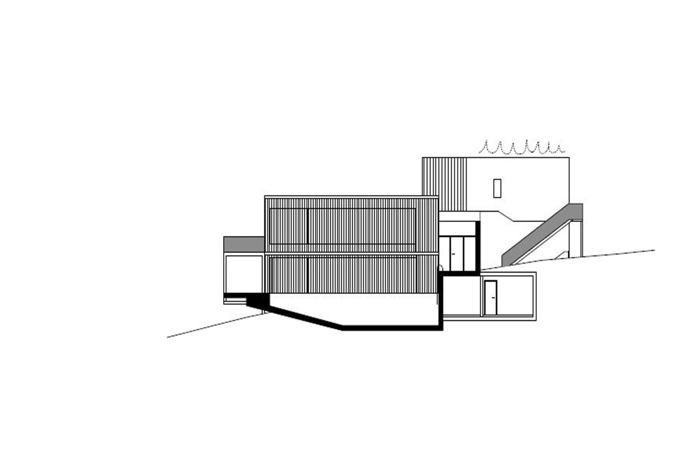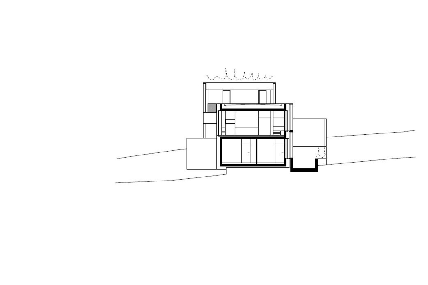 Die wie große Schubladen verschobenen, in den Freiraum greifenden drei Ebenen folgen dem flach geneigten Grundstück. Den Architektinnen ging es darum, die Landschaft für ein „Leben am Hang“ in den höhenversetzten Räumen in das Haus einzubauen. Die Bewohner bewegen sich also täglich spürbar auf der unverwechselbaren Topografie des Orts, wozu auch die definierten Sichtbezüge in Richtung Bodensee beitragen. Dazu gehört auch, dass das Haus nicht eindeutig im Garten endet, sondern sich mit Terrassen, Treppen, Stegen, Stellagen und Betonscheiben schließlich einem trogartigen Pool nach draußen fortsetzt.