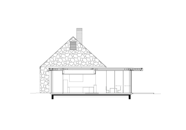 Der große Wohnraum mit dem 3 Meter breiten Kamin wird von einer betonierten Sitzbank gerahmt. Der Flur führt zu den privaten Räumen mit Bad, Ankleide, kleinem Wohnraum und Schlafzimmer. Das Haus ist eingeschossig, das Dach nicht ausgebaut. Als modernes Aperçu ragt ein Pavillon als Zwischentrakt aus den Feldsteinmauern. Er umschreibt Küche und Essbereich und verbindet den privaten Wohnraum mit dem Wirtschaftstrakt der ehemaligen Scheune.
