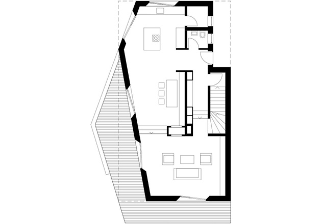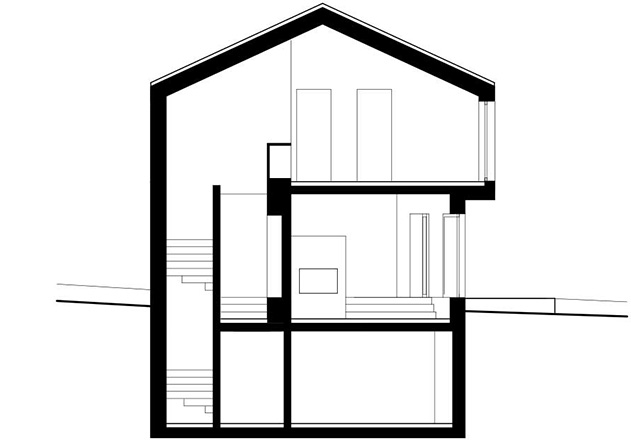 Im Innern verbindet ein Raumkontinuum den fließenden Wohnbereich unten über ein „Treppenmöbel“ mit einer Arbeitsgalerie im Obergeschoss. Kochen und Essen teilen sich einen 3 Meter hohen Raum, von hier führen neben einem Holzkaminofen drei Stufen zur höherliegenden Wohnebene.Die großformatigen Fenster inszenieren die Verbindung nach außen durch ihren schrägen Einbau in der zusätzlich abgefasten Laibung, sie fokussieren damit die verschiedenen Situationen des Gartens.