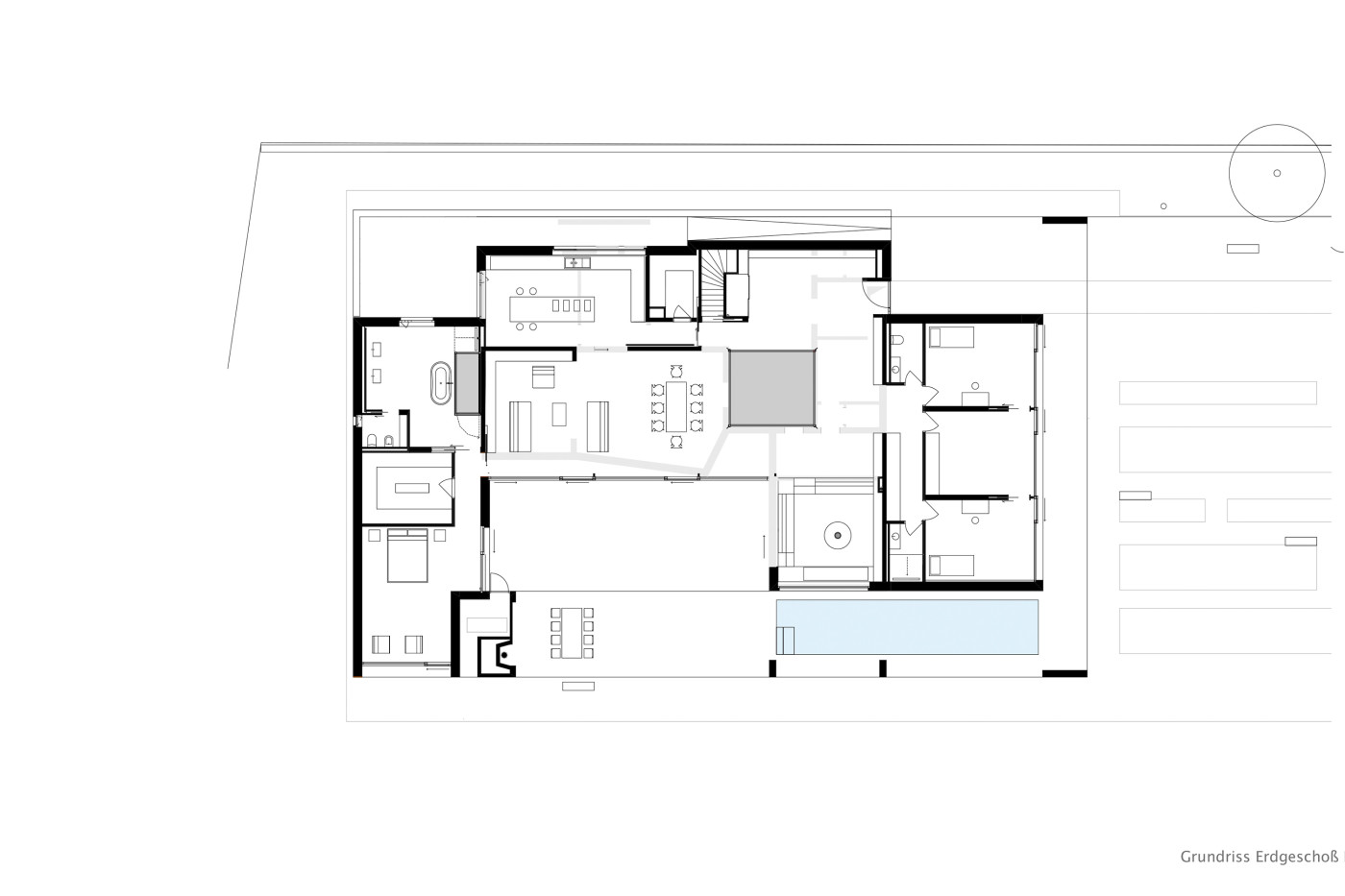 Durch die Vergrößerung des Grundstücks, das großzügig und idyllisch mit dem anschließenden Landschaftsraum des ausklingenden Fichtelgebirges verschmilzt, bot sich die Gelegenheit, Wohnen auf einer Ebene zu organisieren und dabei die Innenräume mit dem Garten zu verbinden und in Beziehung zu setzen. Dazu gehört jetzt auch das Untergeschoss, das mit inneren Höfen (Patios) neue Nutzungsqualitäten für Gäste, Arbeiten und Wellness gewinnt.