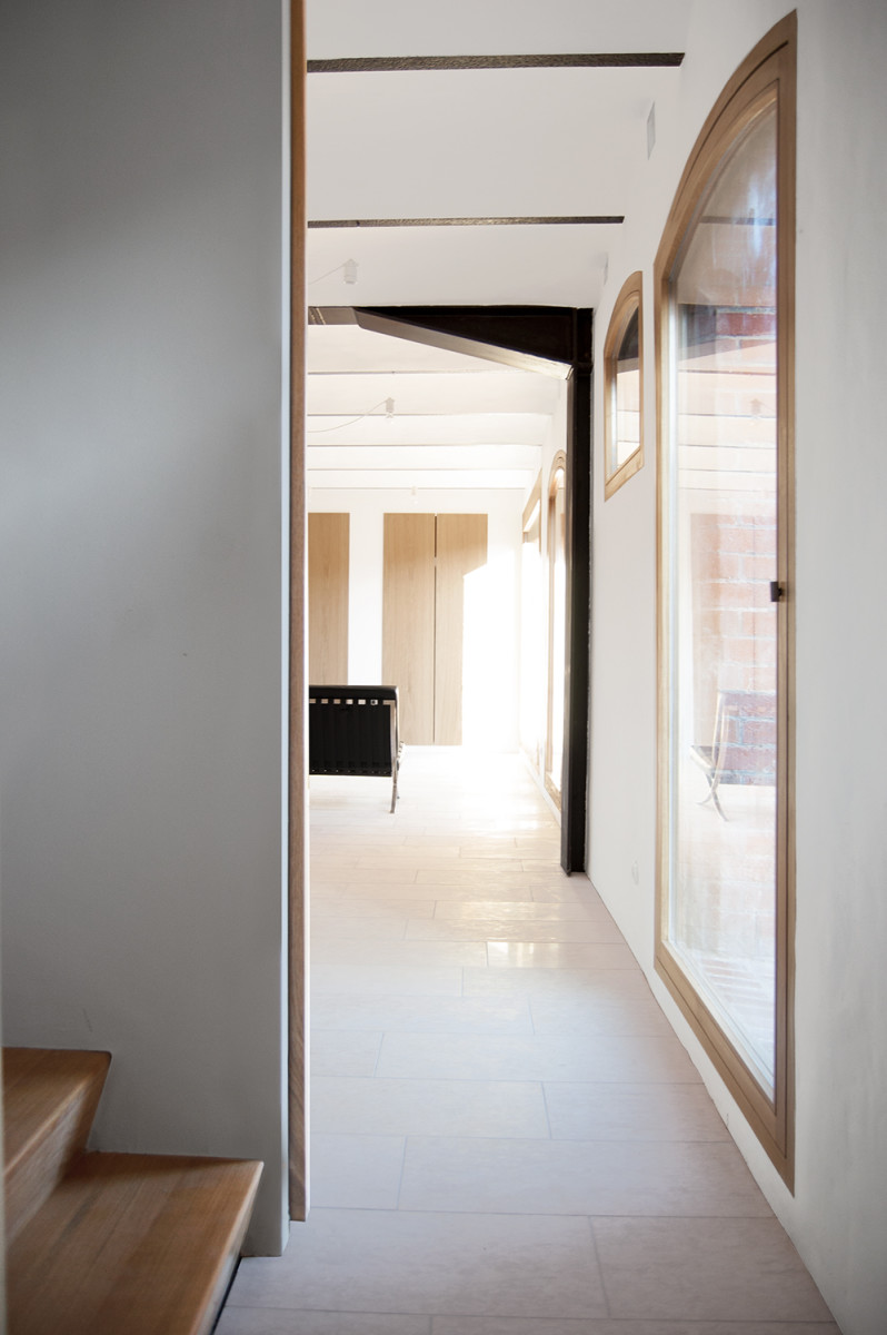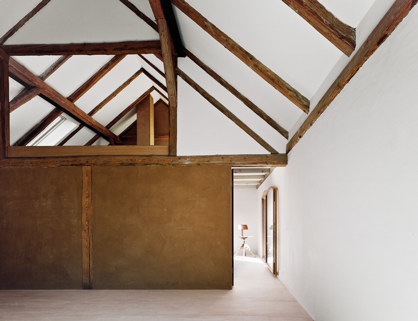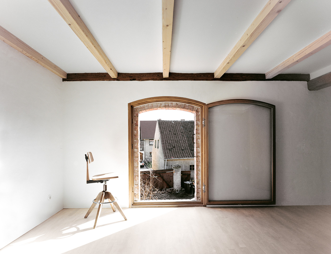 Zum Grundkonzept gehörte – und das war die größte Herausforderung – die vorhandenen Fassadenöffnungen zu erhalten und damit die notwendige Belichtung und Aussicht zu meistern. Da es früher nur Klappläden ohne verglaste Flügel gab, verzichtete man auf eine Fensterteilung oder gar nostalgische Sprossen, die den Lichteinfall behindert hätten. Tatsächlich gelang es, durch minimale Eingriffe den Charakter des landwirtschaftlichen Gebäudes in seiner Umgebung zu wahren. Sein raues, ungeschöntes Äußeres verbirgt die neue Nutzung; erst wenn die Bewohner anwesend sind, die hölzernen Läden und Tore offen stehen und Licht von innen nach außen dringt, gibt es seine neue Bestimmung preis.