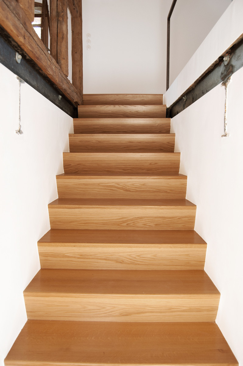 Im Erdgeschoss verlangte die prägende Gliederung durch die preußischen Kappendecken einen überlegten und sorgfältigen Umgang mit der Raumaufteilung. Sämtliche Wände und Eingriffe (wie die neue Treppe) richten sich deshalb nach der Ordnung der quer zum Gebäude verlaufenden Stahlträger, damit sich ein konstruktiv und formal befriedigendes Zusammenspiel ergibt. Auf der Gartenebene werden in erster Linie die Tagesbedürfnisse bedient: mit einer großzügigen Wohnküche, einem Essbereich mit Kamin und den zu beiden Seiten über Fenstertore angeschlossenen Terrassen. Das Obergeschoss bleibt den privaten Funktionen vorbehalten. Man spürt das an der kleinteiligen Raumaufteilung und auch an der wärmeren Materialität wie dem weiß lasierten Eichendielenboden. Hier gibt es ein großes Elternzimmer und ein Bad, dazwischen einen ruhigeren Wohnraum, der auch zum Lesen oder zurückgezogenen Arbeiten einlädt.