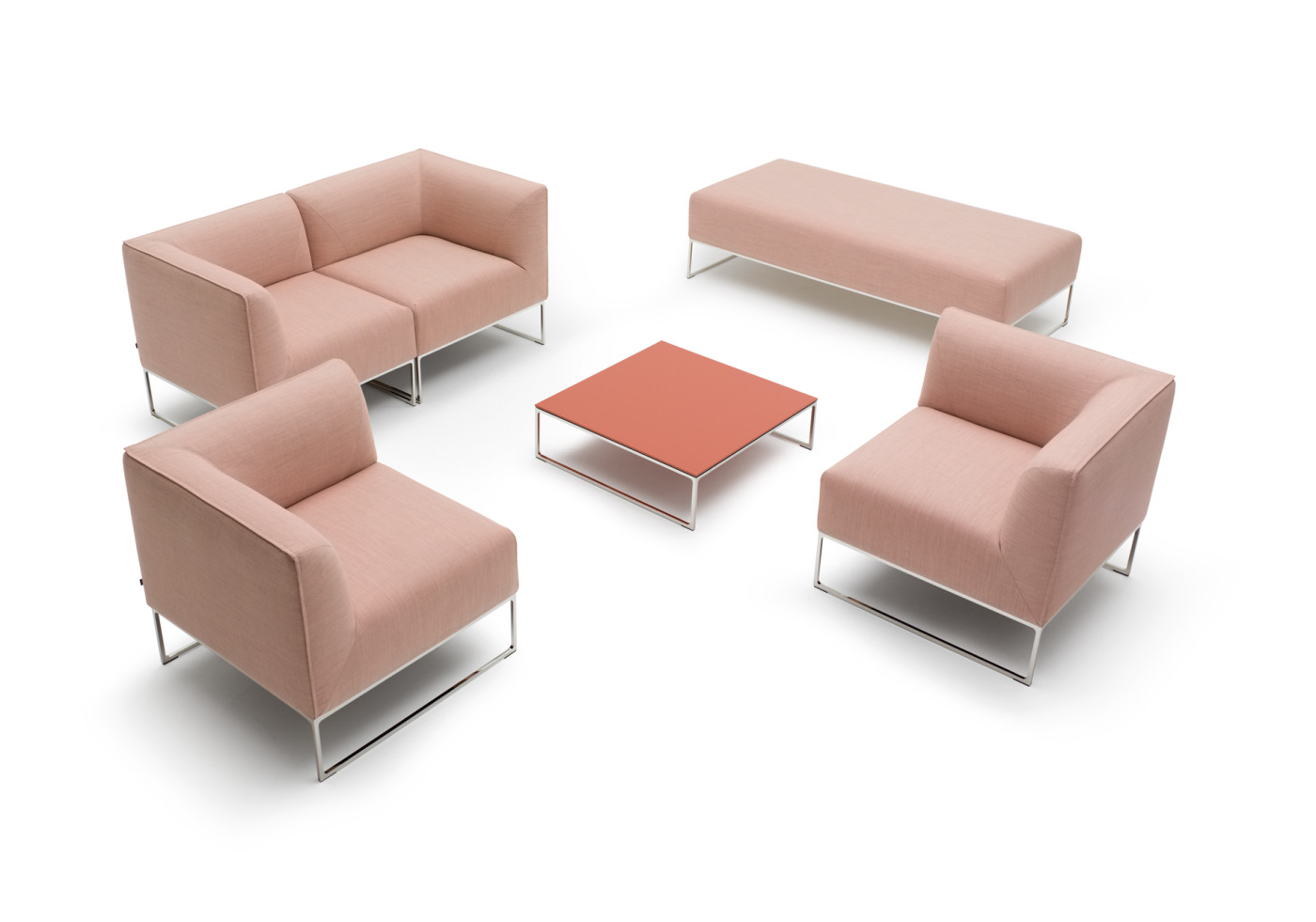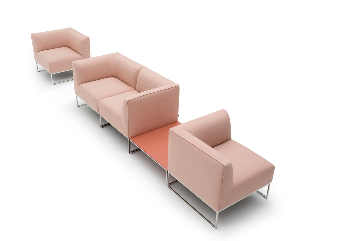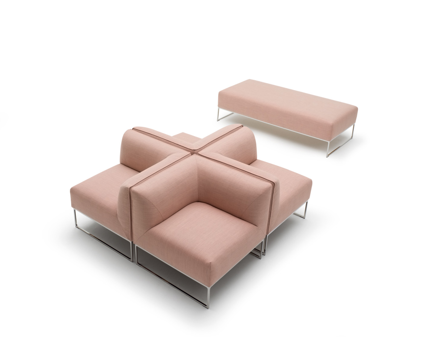 Während die Modulbeine aus filigranen Stahlkufen bestehen, sind sowohl die gepolsterten Sitzflächen als auch die Arm- und Rückenlehnen weich abgerundet. In Kombination mit Zwei- oder Dreisitzern, Hockern und Beistelltischen bietet das modulare Programm Lösungen für verschiedenste Nutzungen.