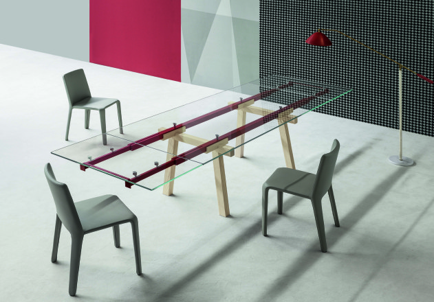 Der belgische Designer Alain Gilles mag keine Ausziehtische. Deshalb hat er den „Tracks Table“ für die italienische Möbelfirma Bonaldo entworfen. Der Unterschied zu anderen Ausziehtischen: der Mechanismus ist das zentrale gestalterische Element. Die rot lackierten „Schienen“ des Tischs stecken in zwei Rahmen aus Eschenholz. Eine darüberliegende Glasplatte enthüllt ihre Funktionsweise. Die Erweiterungen der meisten Tische seien versteckt oder einfach nur angefügt, sagt der Designer, deshalb wollte er einen Tisch entwerfen, der die Transformation zum Thema macht, und ließ sich von den rot-weiß gestreiften Schranken an Bahnübergängen inspirieren. Herausgekommen ist ein spielerisches Möbel, das trotz der zur Schau gestellten Technik mit einer hohen graphischen Abstraktion überzeugt.