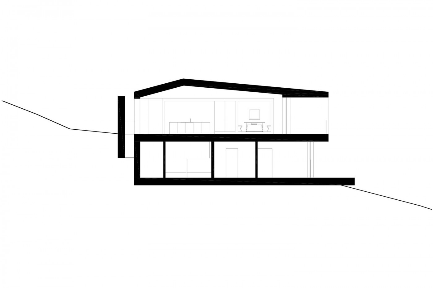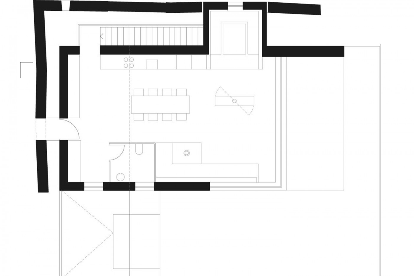 Die Häuser des Ensembles orientieren sich an der Topografie, ohne sie zu verändern. Vorgelagerte Terrassen beziehen den Außenraum ein. Das Wohngebäude betritt man über eine kleine Metallbrücke. Von hier sieht man in den begrünten Raum zwischen der alten Steinmauer und der verschindelten Gebäudehülle. Auf der oberen Ebene ist lediglich eine Toilette als Stahlwürfel eingestellt. Sonst öffnet sich unter der von der Schalung grobstrukturierten Betondecke ein Küchenraum mit drei unterschiedlichen Sitzgruppen: einer Nische als Zirbelstube aus alten Hölzern, die in der Steinfassade durch ein Passepartout aus Stahlblech ablesbar ist, einem großen zentralen Tisch vor der Küchenzeile und einer bequemen Polsterecke um den Holzofen, der aus alten Kacheln gemauert wurde. Ein Wendemöbel mit Fernsehgerät oder Hirschgeweih lässt unterschiedliche Raumdefinitionen zu.