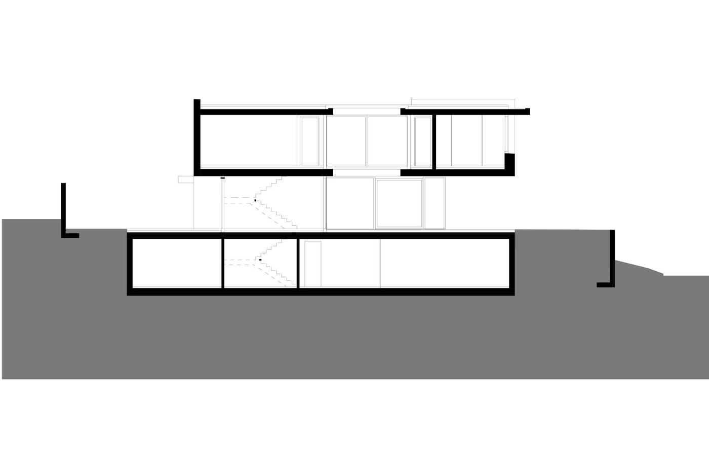Die beiden oberen Ebenen des dreigeschossigen Baukörpers weisen zwei U-förmige Grundrisse auf. Sie stapeln sich um 90 Grad verdreht übereinander, sodass im Erdgeschoss an der offenen Südwestseite ein überdachter Freisitz zum Garten und im Obergeschoss nach Nordwesten eine Terrasse entsteht.