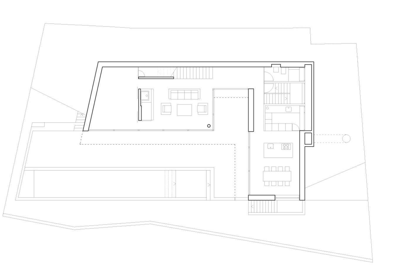 Durch die introvertierte Gebäudeform, die sich um einen schmalen, langen Swimmingpool winkelt, wird das Private der Wohnräume betont, gleichzeitig fokussiert die Öffnung das Panorama der umgebenden Berge mit dem See. Die Villa am See hat keine direkte Anbindung an die Straße. Für das Auto hat es einen Stellplatz in einer Tiefgarage unterhalb, von hier nimmt man den Fußweg oder einen öffentlichen Aufzug. Die beiden Schenkel des Hauses, zwischen denen auf der obersten Ebene der Lichthof des Eingangs liegt, teilen das Massivhaus in zwei kommunizierende Volumen. Zunächst kommt man auf der privaten Ebene an.