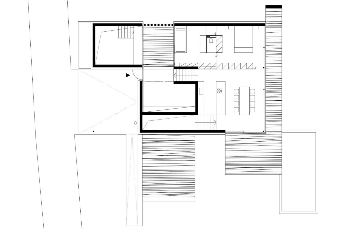 Die Split-Level-Bauweise ergibt unterschiedliche Raumhöhen in allen Geschossen, ein eingeschnittener Hof belichtet die Räume im Südosten und erlaubt ansonsten eine geschlossene Front zu den Nachbarn. Die vollverglaste Fassade nach Südwesten wird durch ein vorgehängtes Rahmenelement verschattet, es führt den Innenraum nach außen, schützt vor Bewitterung und bietet an seinem auskragenden Endpunkt einen neugierigen Aussichtsplatz. Das weit hervortretende Dach über dem Carport markiert und schützt den Eingang. Die Diele überrascht durch den Ausblick über den Lichthof. Zunächst erreicht man ein halbes Geschoss tiefer die Küche, die sich an den Betonkern anlehnt. Hier liegt peripher der Elternbereich. Am Essplatz vorbei folgen tiefer gestaffelt der Wohnraum mit unterschiedlichen Deckenhöhen – licht und hoch zur Terrasse, bergend über der Polstergruppe – und schließlich die Kinderzimmer.