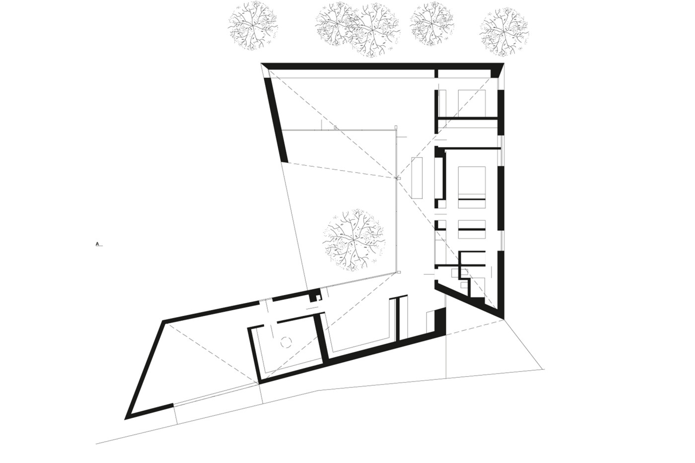 Die unterschiedlich geneigten Dachflächen setzen das unregelmäßige Polygon des Grundrisses räumlich fort, die umliegende Bebauung ist weitgehend ausgeblendet. Umso überraschender ist es, dass man nach dem Eingangsschlund, wenn sich die Haustür öffnet, den privaten Hofbereich und das gesamte Innenleben ausgebreitet sieht. Wie ein heller Kreuzgang legt sich ein raumhoch verglaster Korridor um diesen Freiraum, von dem alle weiteren Räume abzweigen. Lediglich der Küchentresen steht zum Andocken in der Passage. Das hohe Volumen wird von den Facetten der Dachuntersicht geprägt.