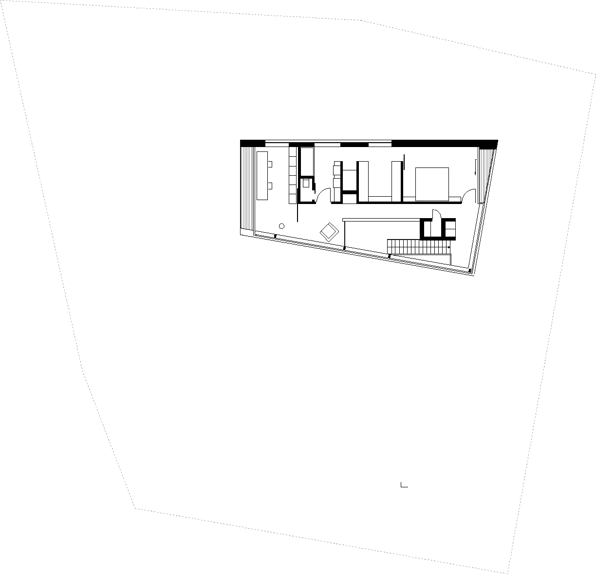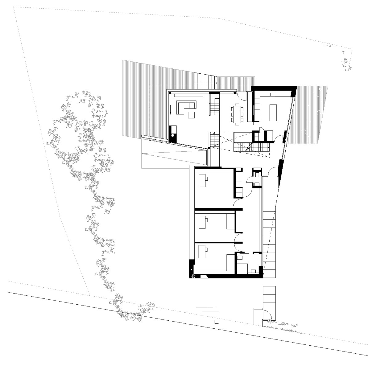 Die Lage am Karlsruher Geigersberg wird von großen Ein- und Mehrfamilienhäusern bestimmt, die sich mit freien Winkelformen und he­t­erogenen Dächern auf den leicht geneigten Gartengrundstücken verteilen. Auch dieser Neubau reagiert auf die Topografie, setzt sie sogar im Innern fort. Tatsächlich sind es vier Ebenen, von denen aber nur jeweils zwei in Erscheinung treten. Dadurch gelang es, das passable Volumen auf dem relativ kleinen, zumal mit alten Bäumen bestan­denen Grundstück unterzubringen, ohne dass der Maßstab der umgebenden Bebauung gestört wird. Das Haus gräbt sich in den Baugrund und wächst gleichzeitig aus ihm heraus.